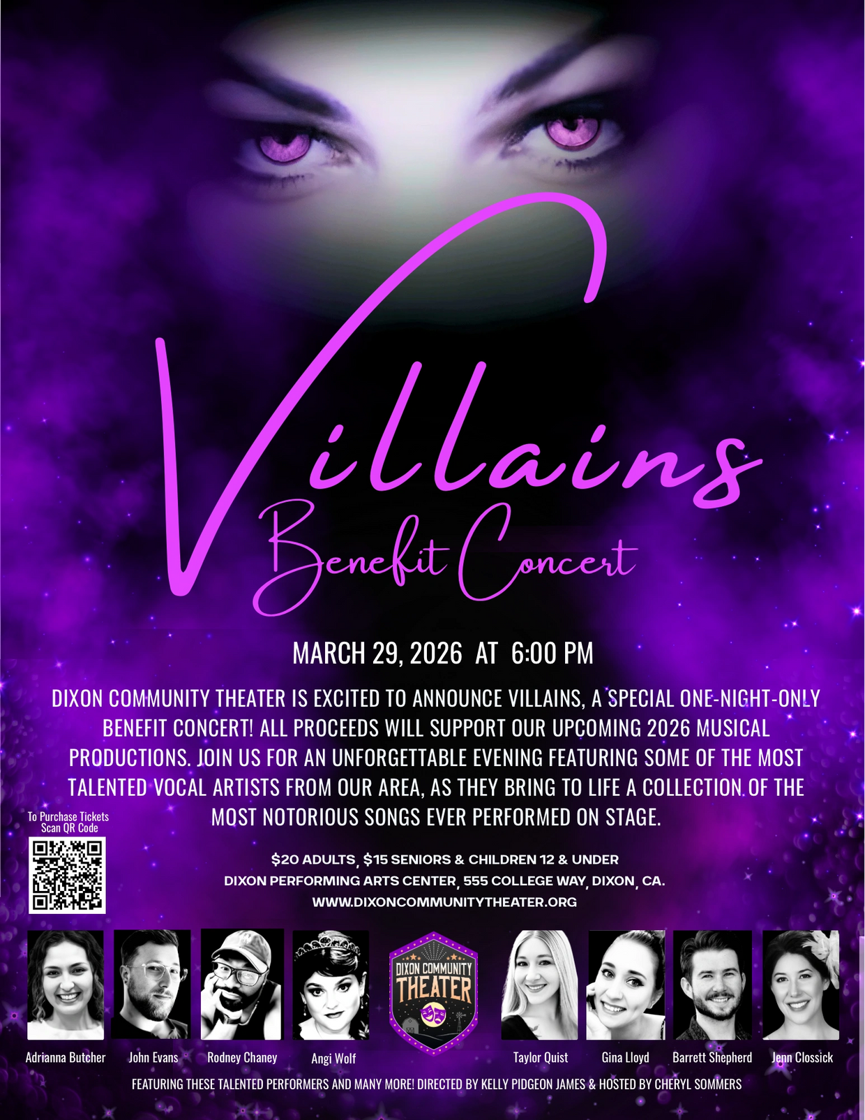 DIXON COMMUNITY THEATER IS EXCITED TO ANNOUNCE VILLAINS, A'SPECIAL ONE-NIGHT-ONLY BENEFIT CONCERT! ALL PROCEEDS WILL SUPPORT OUR UPCOMING 2026 MUSICAL PRODUCTIONS. JOIN US FOR AN UNFORGETTABLE EVENING FEATURING SOME OF THE MOST TALENTED VOCAL ARTISTS FROM OUR AREA, AS THEY BRING TO LIFE A COLLECTION OF THE